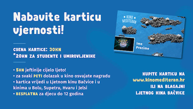 Kao vlasnici kartice vjernosti, svakim dolaskom u Kino Mediteran digitalna kina u Splitu, Bolu, Hvaru, Supetru i Jelsi ostvarujete pravo na 5kn popusta na redovnu cijenu ulaznice (30kn).